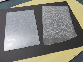 Put the piece of embossed wax paper between two pieces of card stock, any type, I used one piece of glossy and one plain piece, now iron the stack and you will end up with two pieces of wax resist card stock. The bit I like best is then colouring the card stock with ink pads or sprays and seeing the resist pattern pop out. Here's a couple of mine